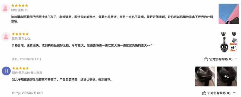 同时为了满足消费者的需求,Darek的店铺还在产品组货策略方面下了不少功夫。他们将单品调整为潜水面罩+防水耳塞的组合套装形式,大大提高了产品的性价比与消费者体验。Darek表示:“我们非常重视消费者的反馈,这个调整也是通过此前看到的消费者反馈做出的优化与改进。”