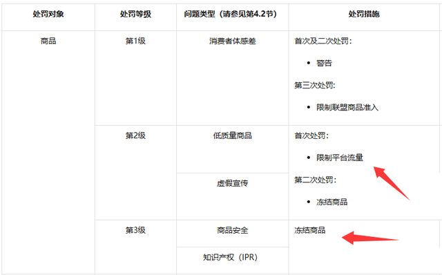 警告、限制联盟商品加入、限流限单、冻结商品(分暂时冻结和永久下架)、限制上品数量、封店(分暂时冻结和永久封店)、限制提现、关闭店铺未完成订单。