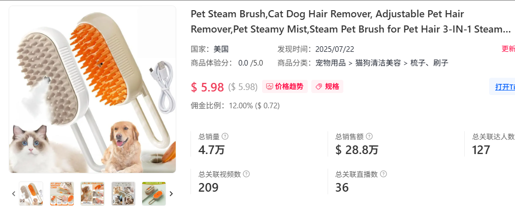 在2025年规模将达1570亿美元的美国宠物市场,一款融合蒸汽润滑、硅胶梳齿和可拆洗设计的创新宠物毛梳近期热度飙升,登陆TikTok美区仅半个月狂销4.7万单,单日最高销量突破8600单,斩获28.8万美元销售额。